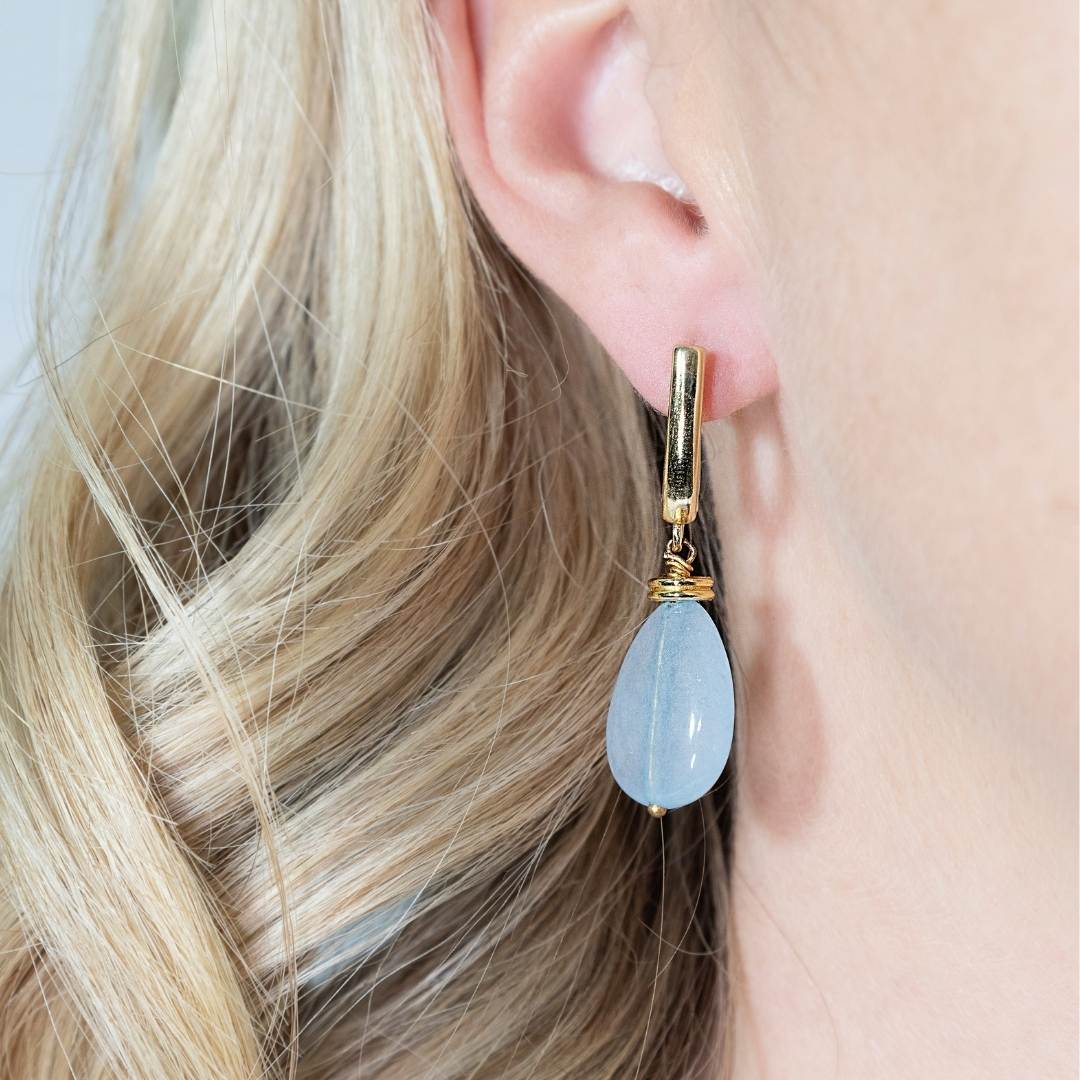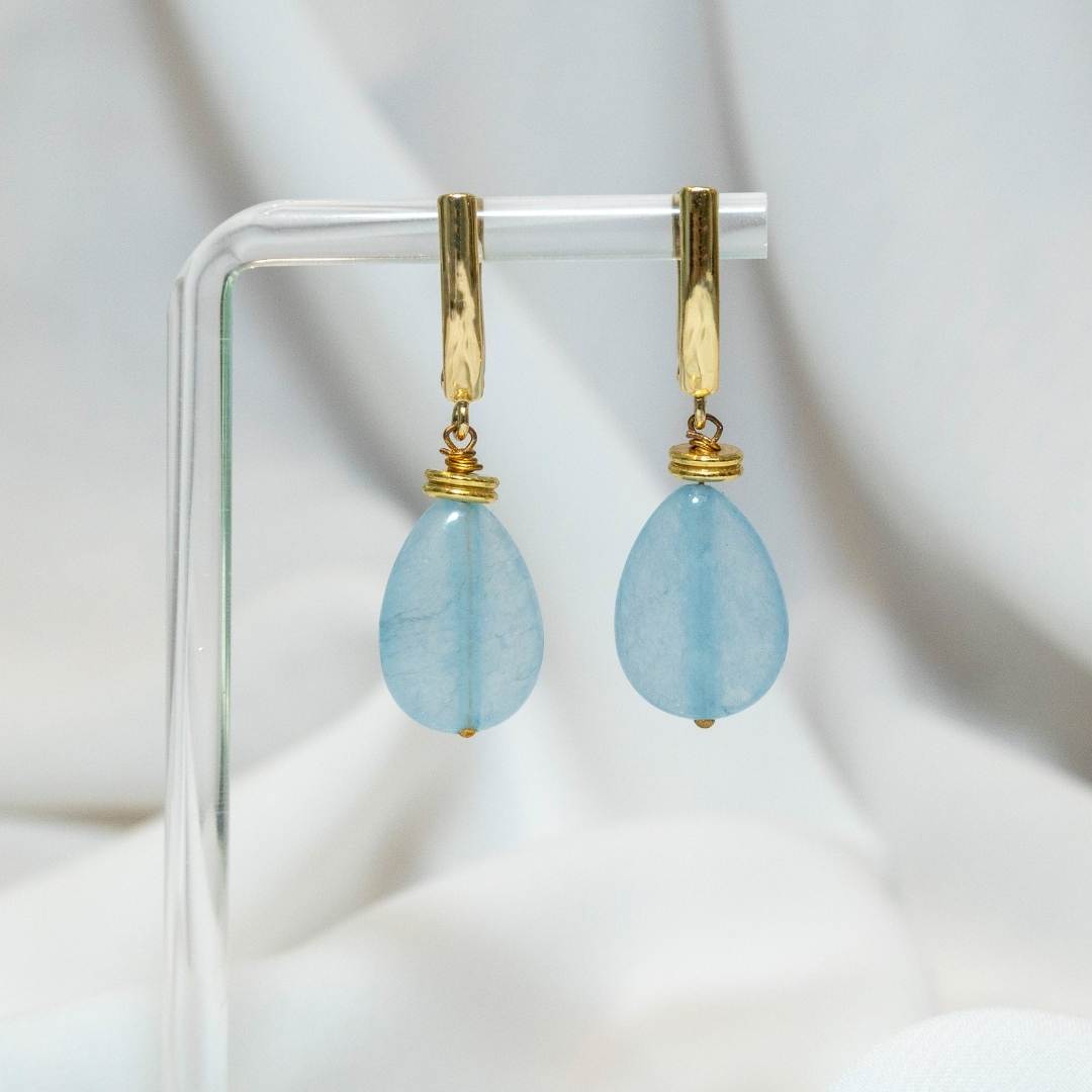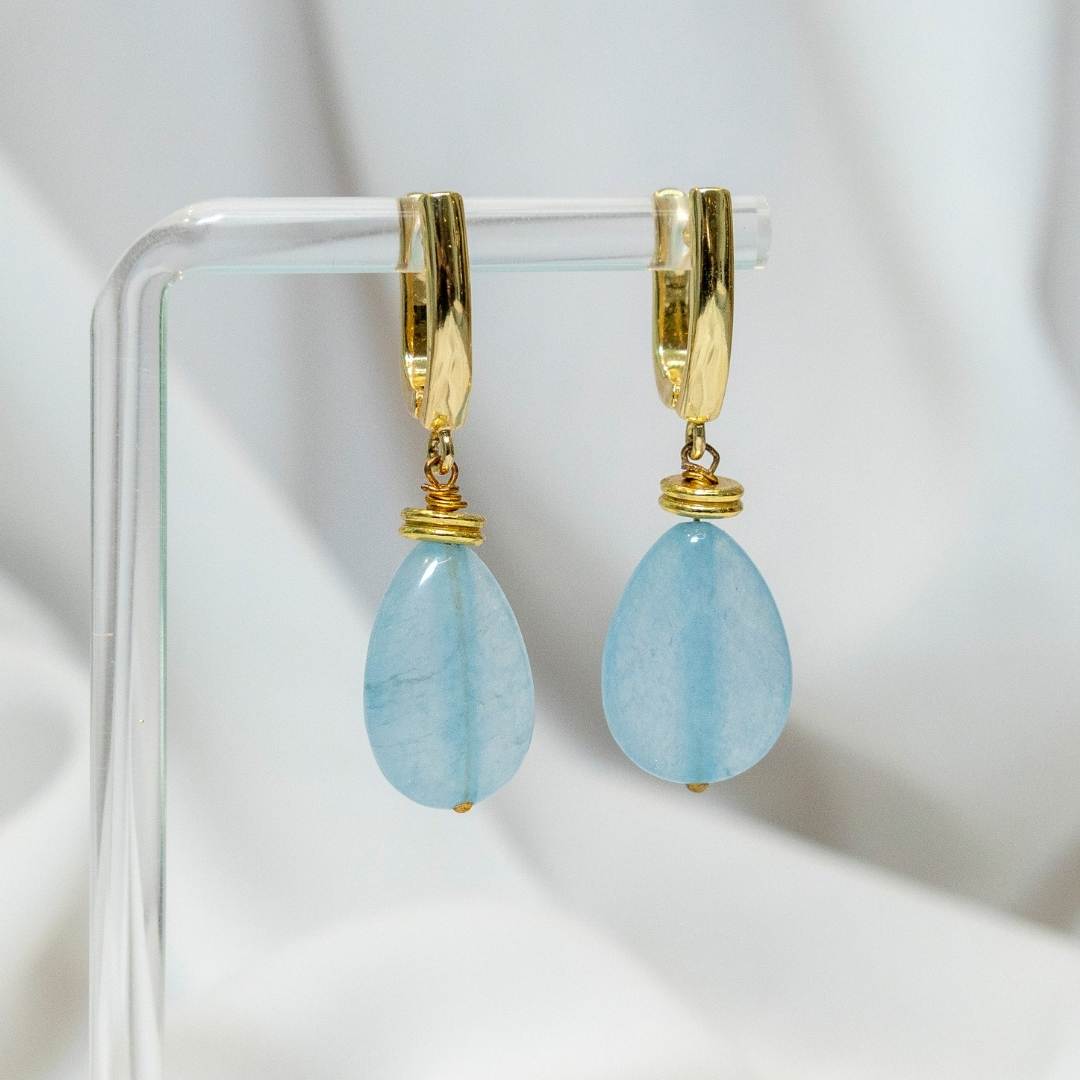 Handcrafted with 18k gold plating, these Blue Allium earrings feature beautiful light blue coloured natural white jade gemstones for a touch of natural elegance. Perfect for adding a pop of colour to any outfit. Make a statement with these unique pieces!