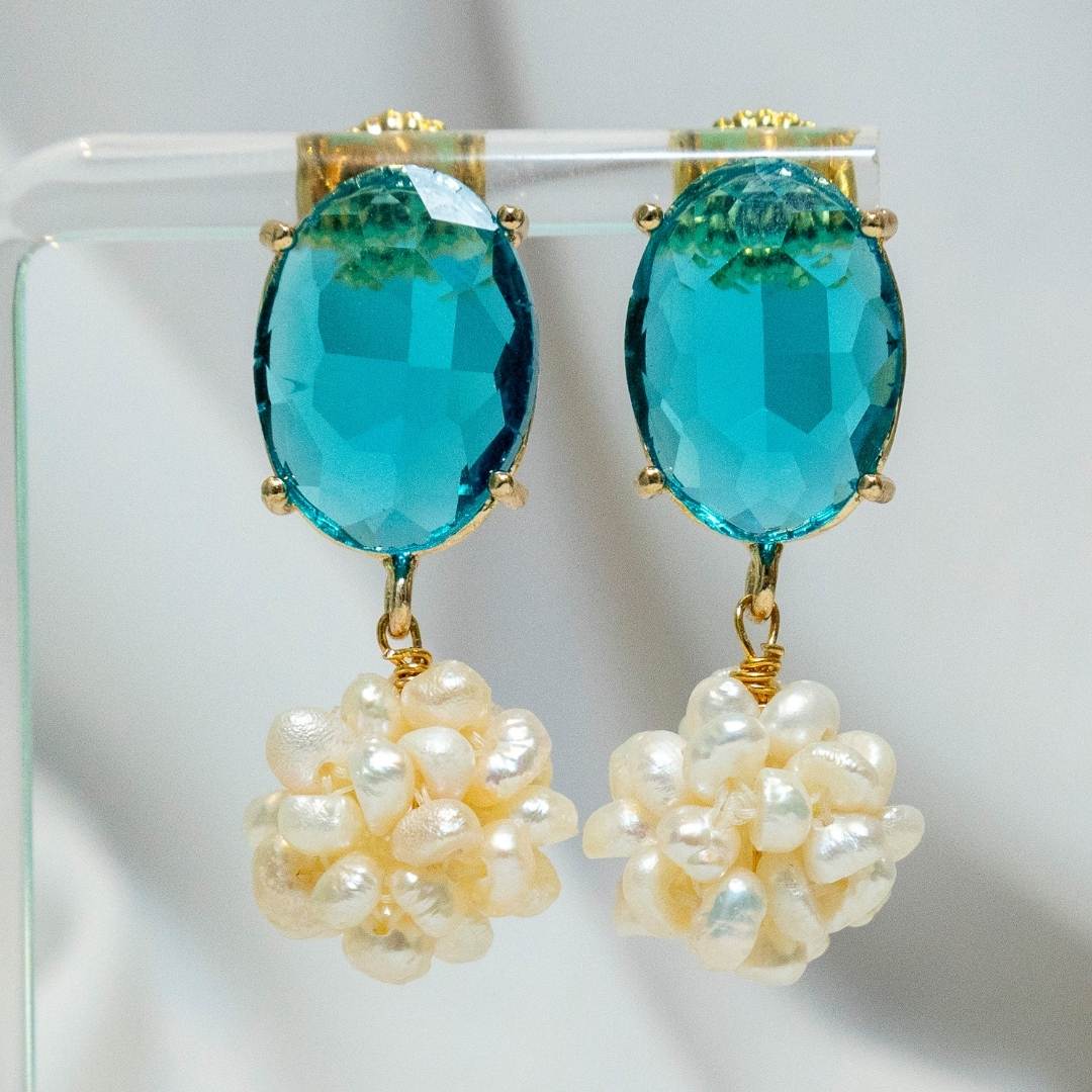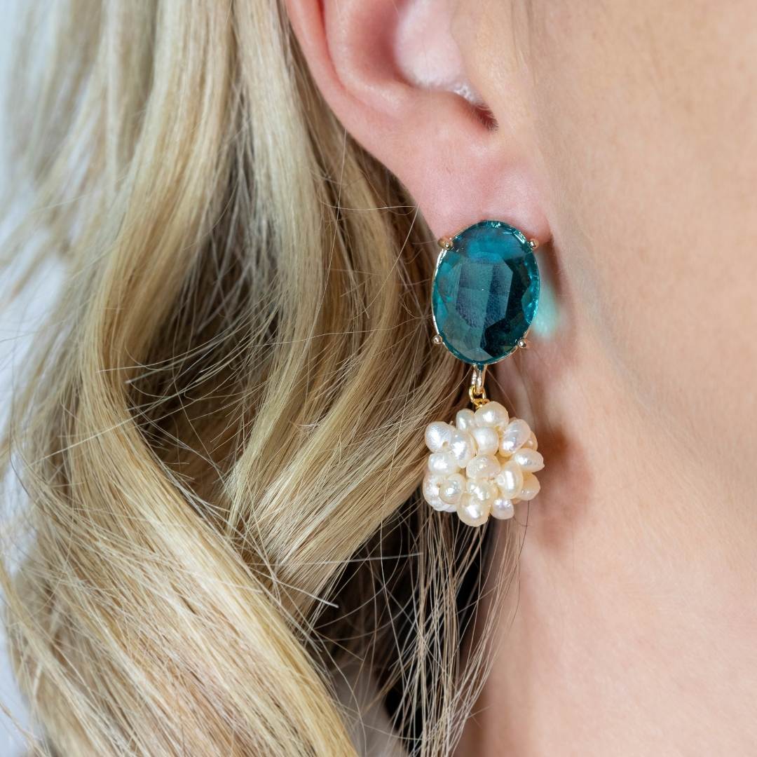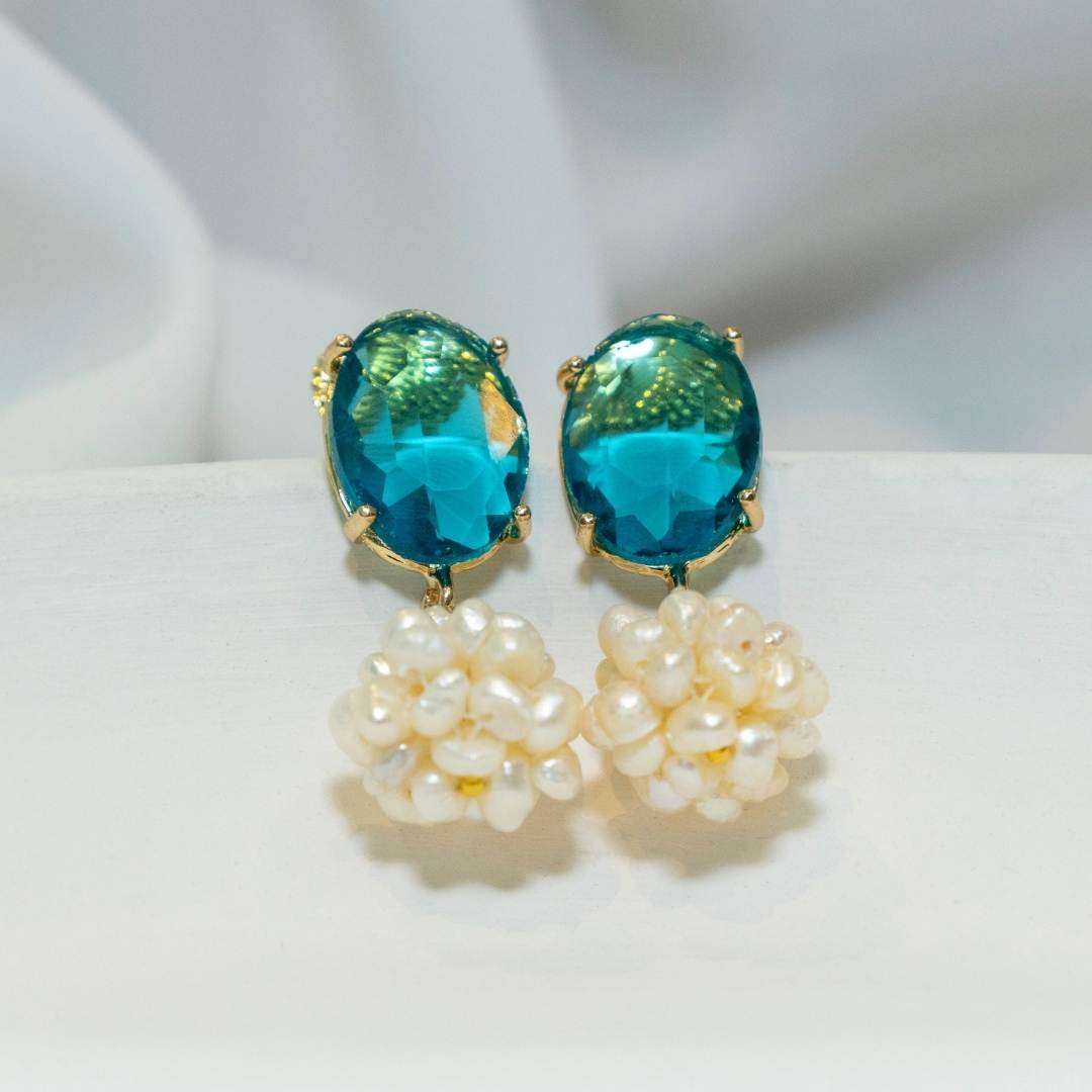 Introducing Blue Bella earrings - a playful touch to your style! These unique earrings feature gemstones, genuine pearl balls, and an 18K gold plated finish. Handmade with love for a chic and quirky touch to any outfit. (Limited edition, so grab yours now!)
